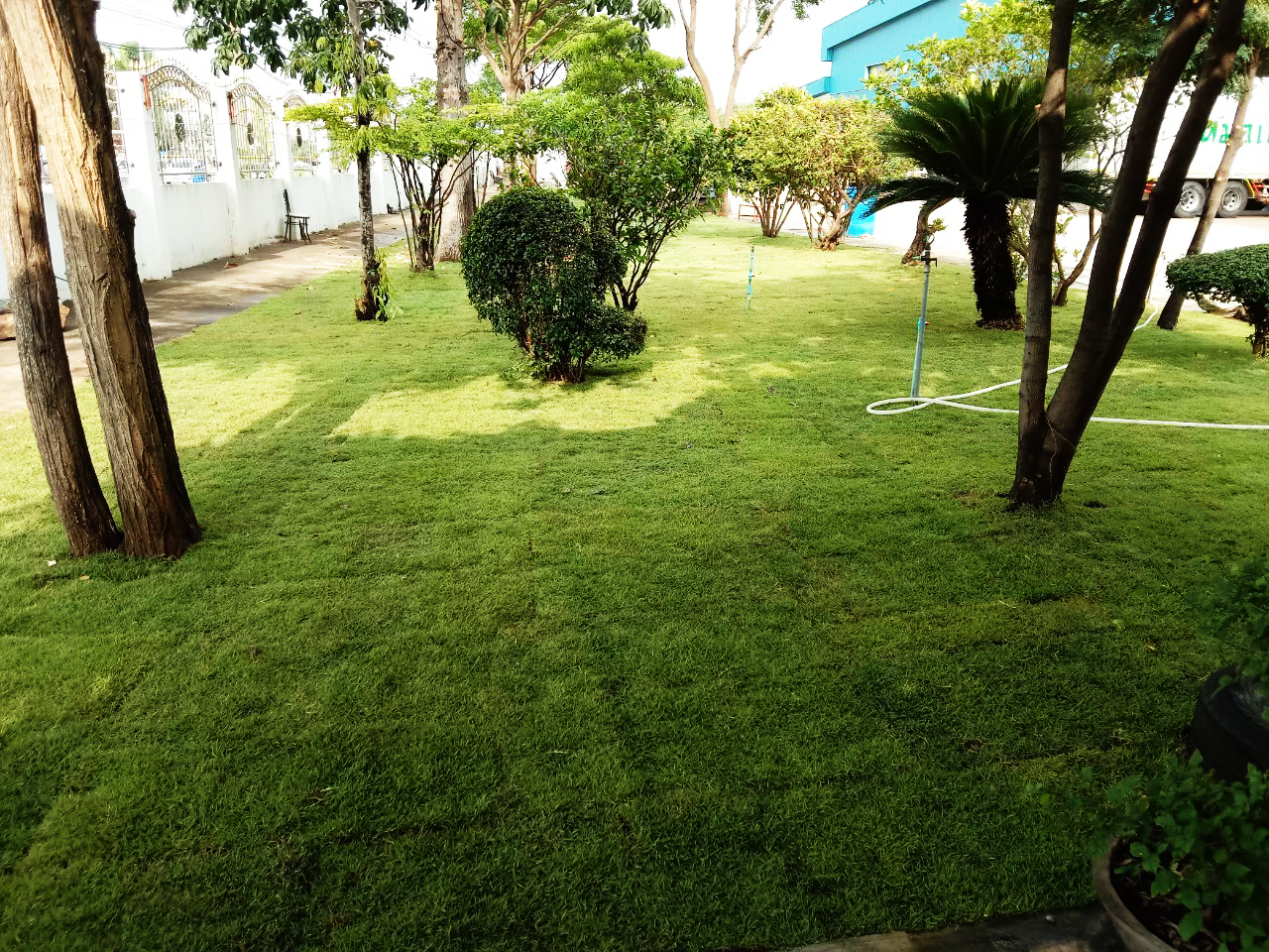 กำจัดหญ้าเก่าทิ้ง ปลูกต้นไม้และปูหญ้าบริเวณรอบบ้าน บ้านลูกค้าย่านสาทร