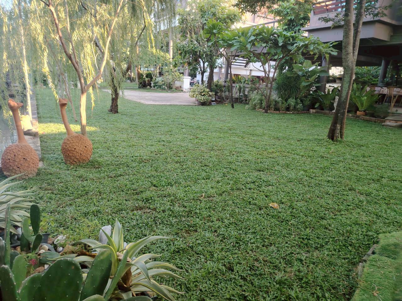 หญ้าไทเป เป็นหญ้าใบใหญ่เหมือนหญ้ามาเลย์ ตอนปลูกใช้การปักดำ ใช้เวลา 3-4 เดือน ถึงจะเต็มพื้นที่ ซึ่งช่วงเวลาที่รอเต็มพื้นที่ ต้องหมั่นเก็บวัชพืชที่ขึ้นแทรกด้วยนะค่ะ ไม่เหมาะกับพื้นที่กลางแจ้ง บางพื้นที่ปลุกกลางแจ้งแล้วต้นหญ้ากลายเป็นสีแดงค่ะ แต่ข้อดีคือ ไม่ต้องตัดใบค่ะ